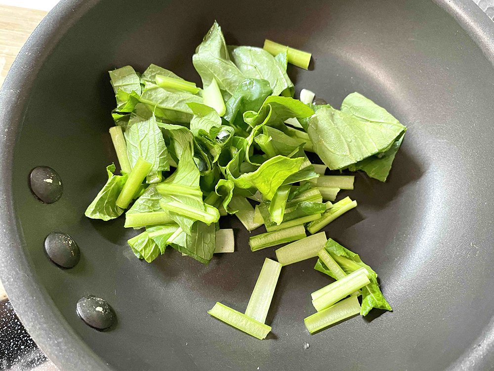 - フライパンを熱し、オリーブオイルを引く。小松菜を軸から炒めて火が通ったら葉の部分も入れて炒める。