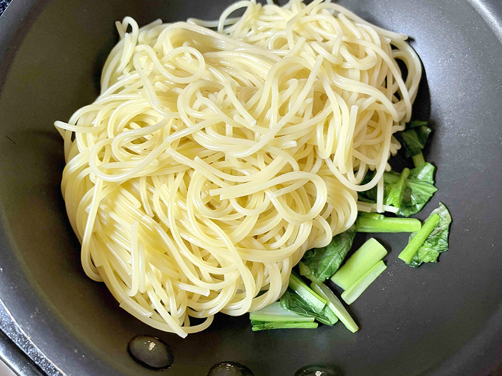 - 小松菜に火が通ったら、パスタ・顆粒和風出汁・塩を入れてさらに炒める。