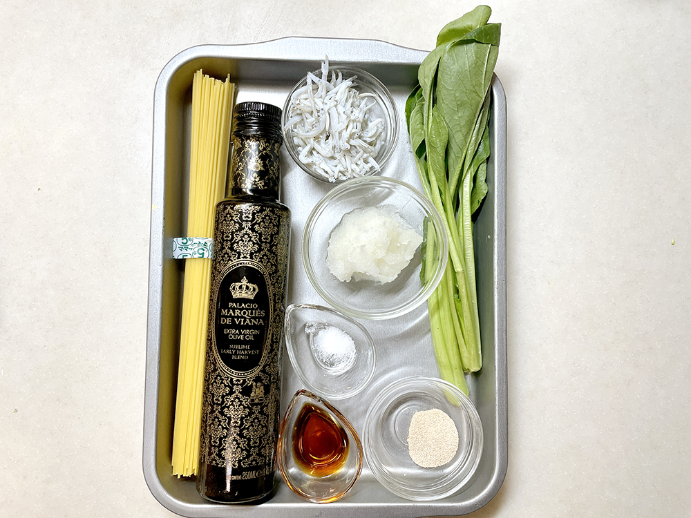 ポン酢が香るさっぱりパスタ!オリーブオイルで炒めた小松菜とおろしポン酢、しらすの最強トリオです。