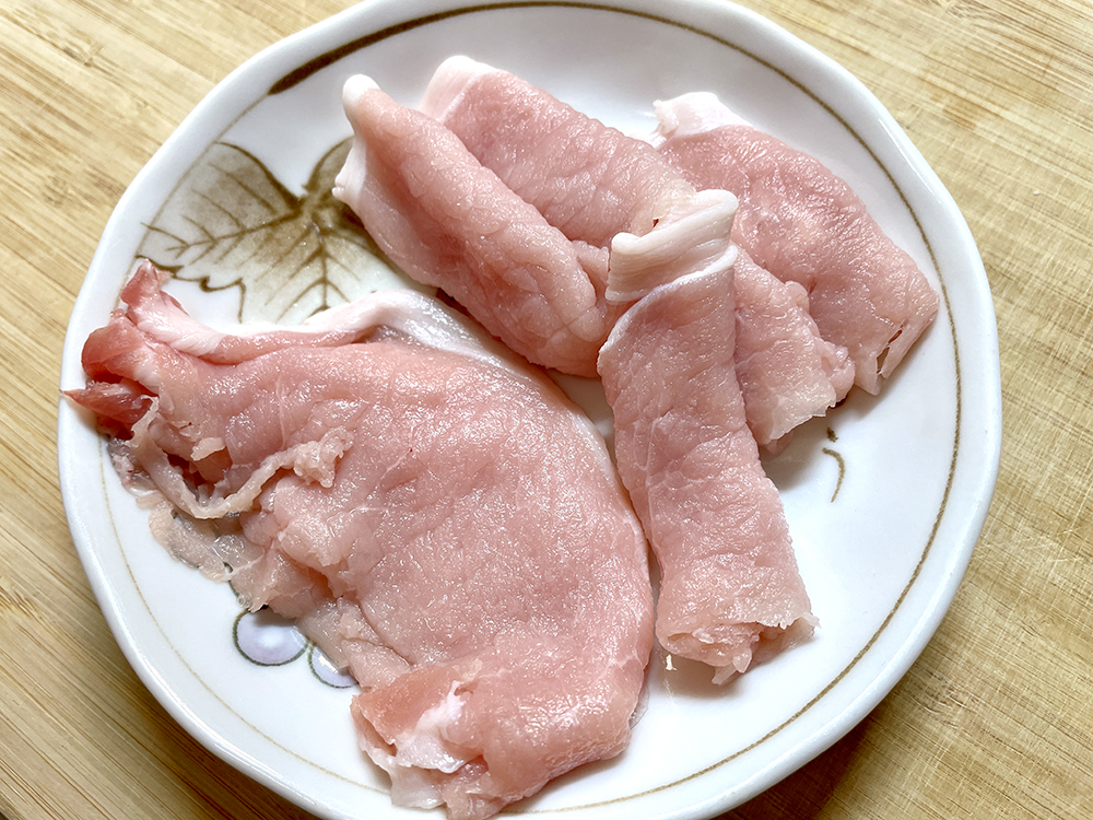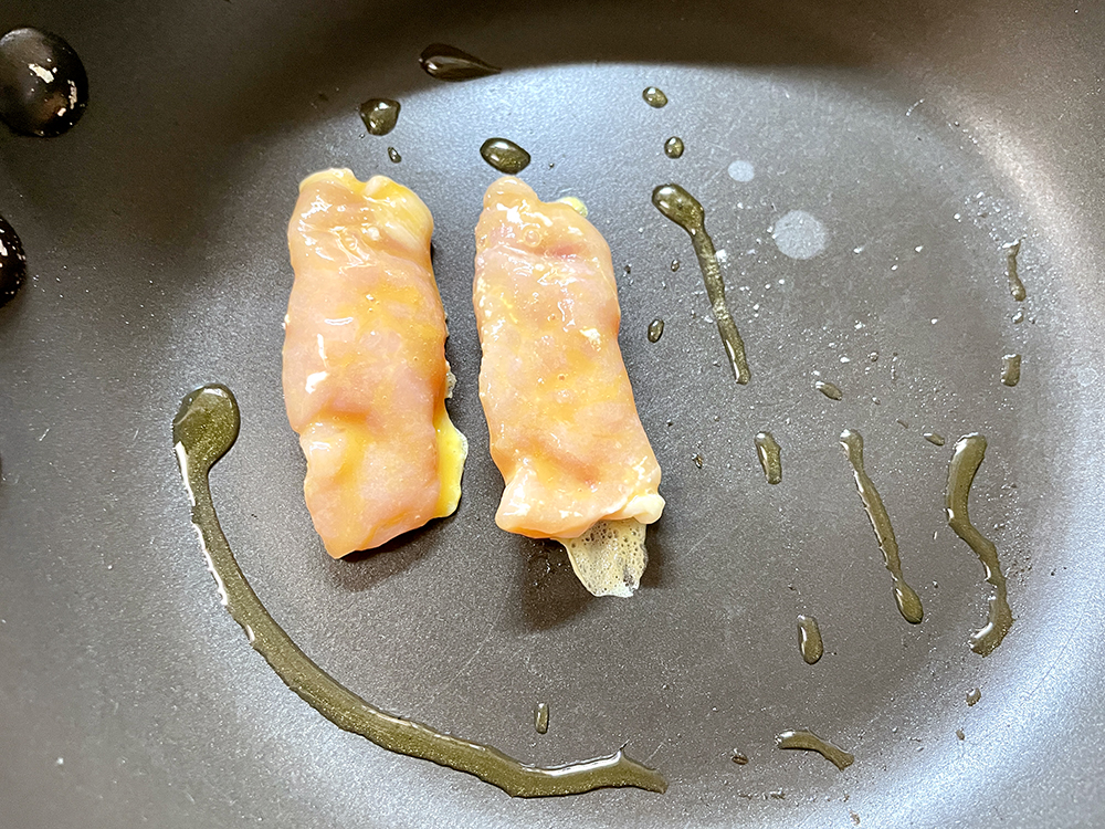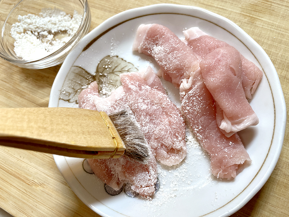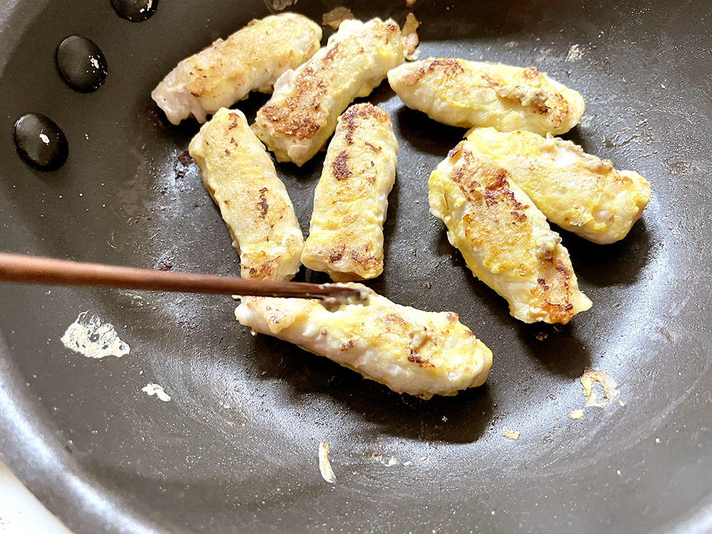 小麦粉をまぶした豚肉を溶き卵にくぐらせて焼いていく。