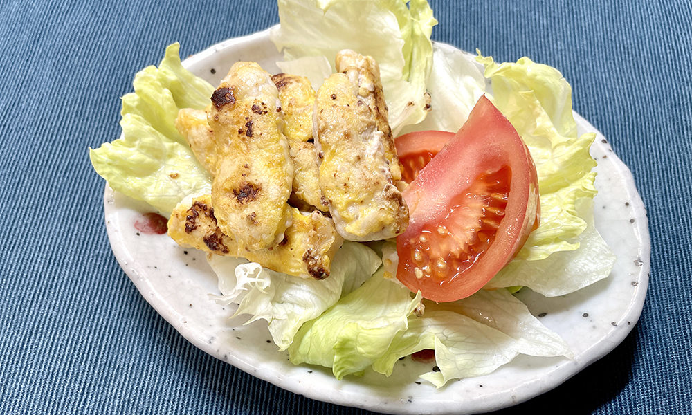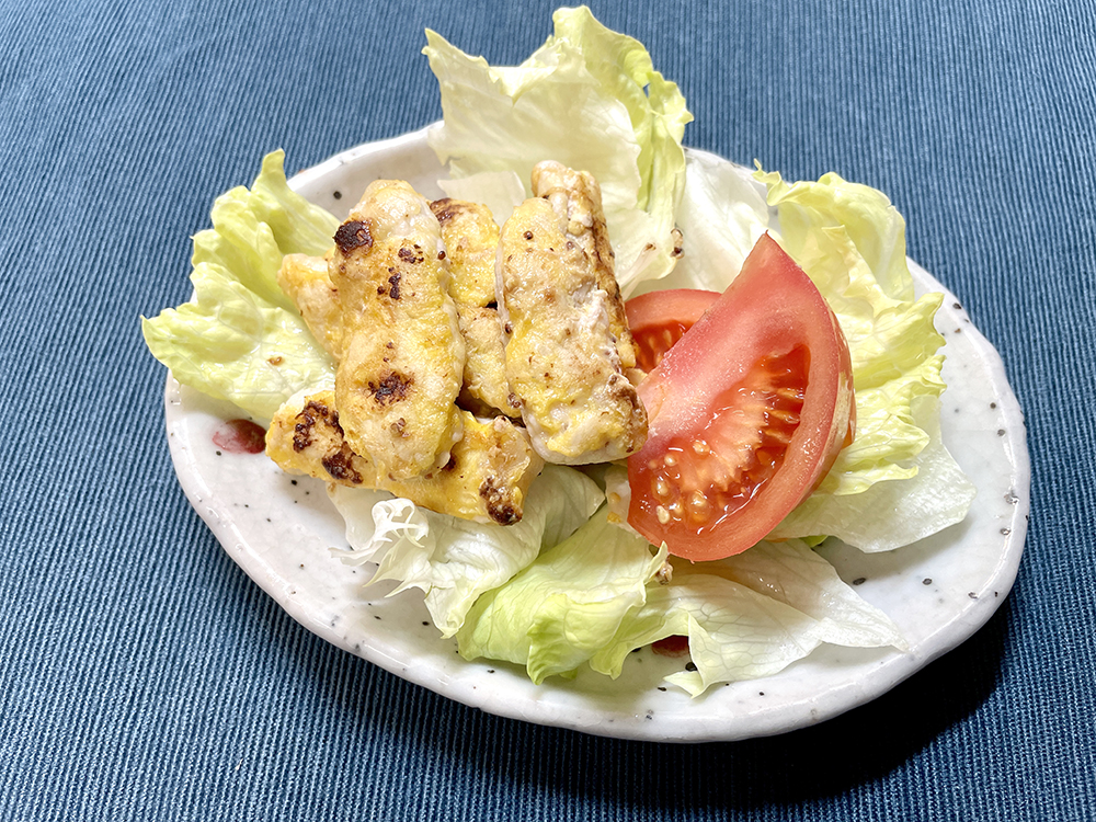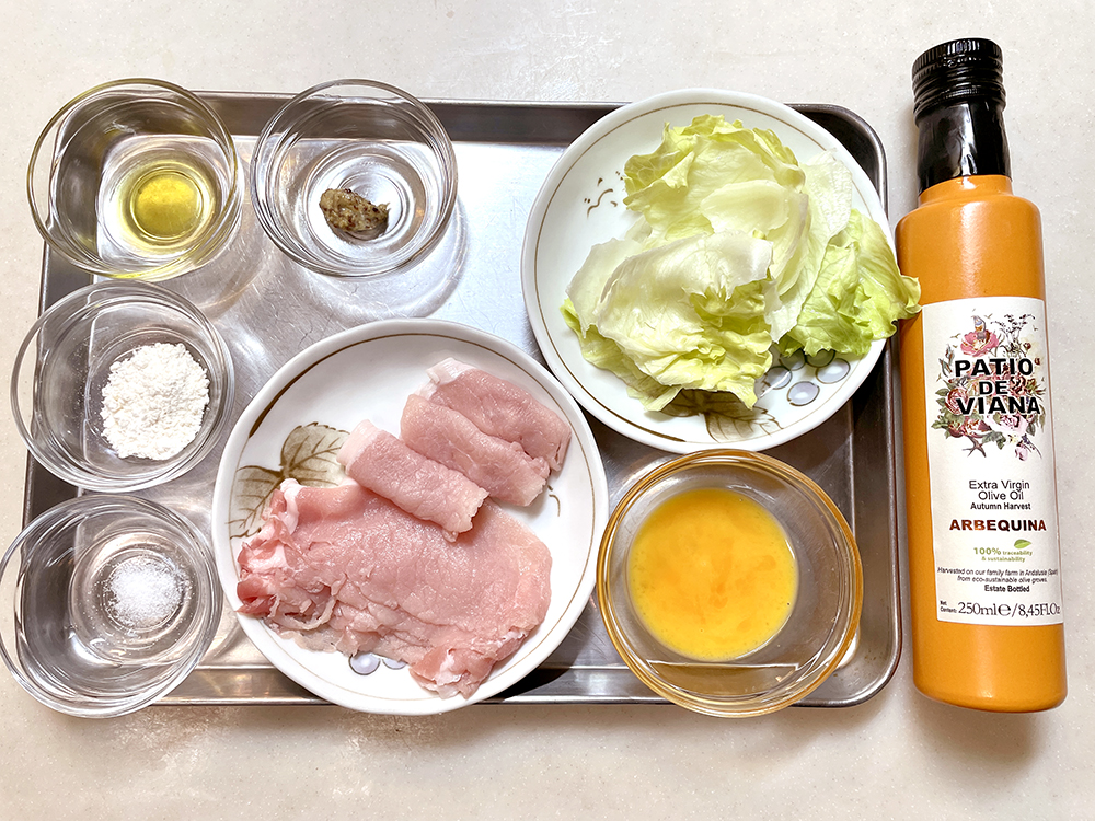 - 器に野菜を盛り付け、ポークピカタを乗せる完成です。