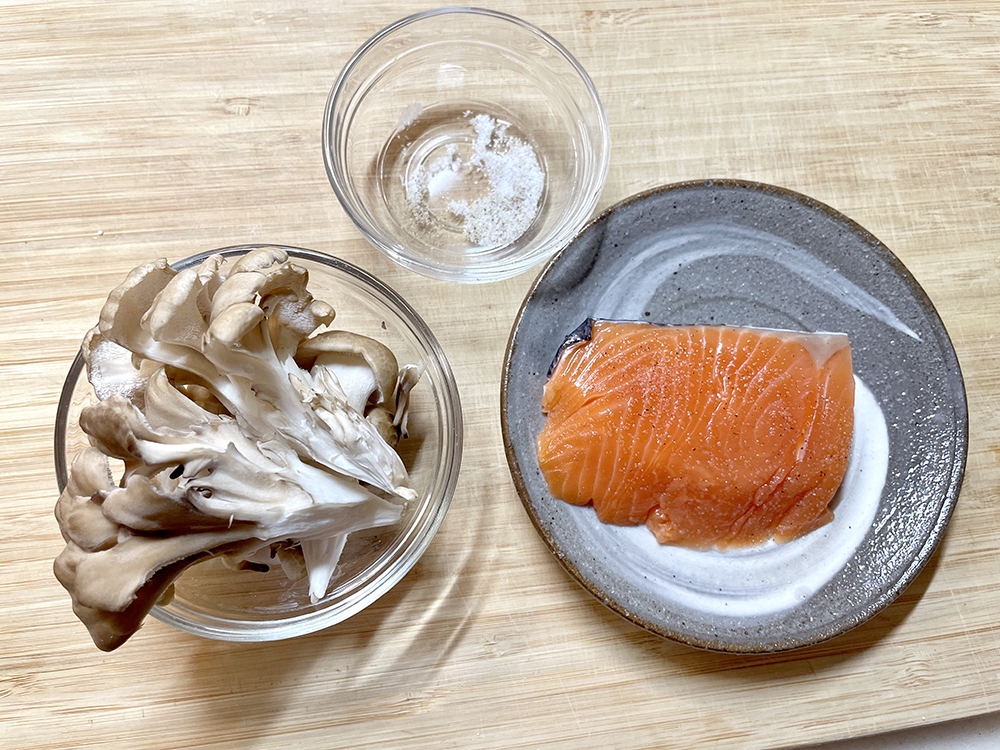 - 鮭に両面塩胡椒を振る。(少し残しておく)