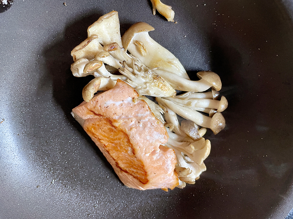 片面2分程度焼いたら舞茸・ぶなしめじもフライパンにいれて焼く。
