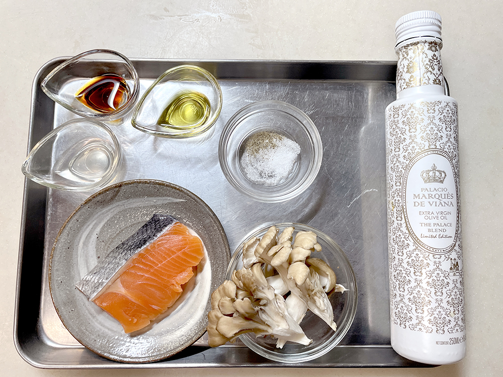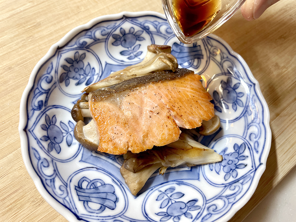 - 器にキノコ・鮭を盛り付け、濃口醤油とレモン汁を合わせたタレをかければ完成。