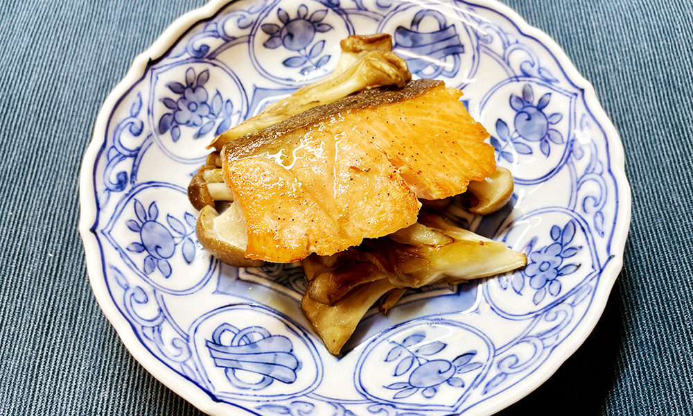 - 器にキノコ・鮭を盛り付け、濃口醤油とレモン汁を合わせたタレをかければ完成。
